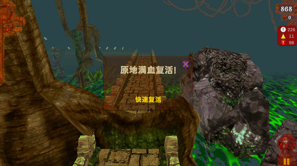 3、要是不小心掉落悬崖,或是撞到树上,别担心,点击即可原地满血复活!不过,需要先前往商店购买复活道具才行。