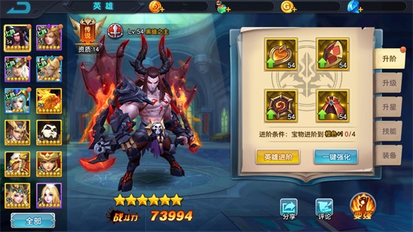 游戏的核心玩法围绕英雄培养展开,英雄获取途径包含抽卡和收集碎片两种方式,后续可对英雄执行升级、升阶、升星、技能激活与强化、装备穿戴等养成操作。通过挑战日常关卡与地下城关卡,英雄培养所需的各类材料基本都能获取,无需耗费大量时间精力去反复刷副本。