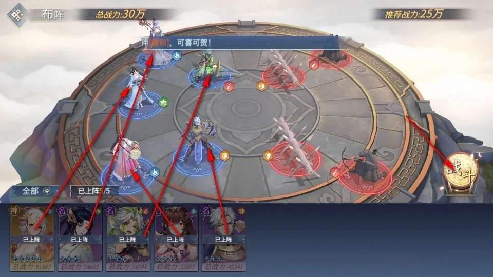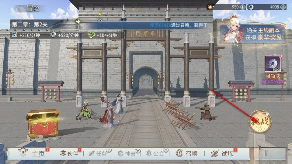 接下来我们在冒险主页点击挑战,就能进入主线剧情的推进流程。根据我们已有的伙伴进行上阵安排,参与战斗。