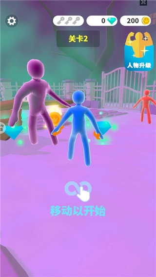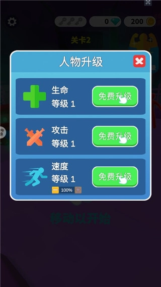 点击右上角的人物升级按钮能够增强角色的各项属性,首次操作是免费的,之后则需要消耗金币或者钻石。