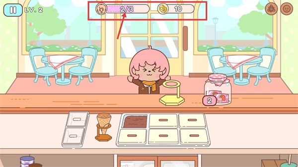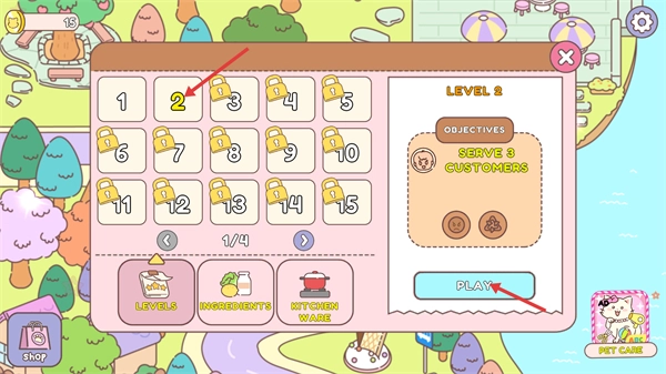 在关卡选择界面点击【LEVEL2】,确认目标是【SERVE3-CUSTOMERS】后,按下【PLAY】按钮就能进入该关卡开启经营。