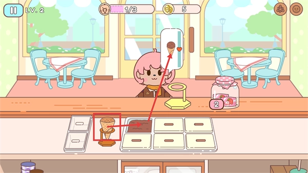 进入关卡后,按照顾客点的【巧克力口味冰淇淋】,先选好【冰淇淋蛋筒】,接着淋上对应的【巧克力酱料】,这样就能做好餐品交给顾客了。