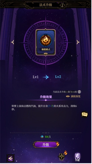 法术系统设定如下:法术品阶划分为精良、史诗、传说、太古四个等级,获取途径以次元水晶抽取为主,部分游戏礼包奖励也可作为补充来源。法术升级机制与品阶无关,无论何种品阶的法术,每提升一级所需消耗的魔力之尘数量固定;升级后法术效果会得到增强,且法术的可升级上限由主角等级决定,主角等级越高,法术能升级到的最高等级就越高。而法术升阶则受品阶影响,品阶越高的法术,升阶时需要消耗的记忆之尘和追忆以太越多,相应地,升阶后提升的能力也更为显著。