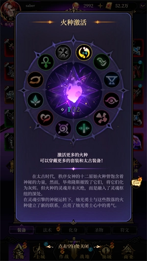 火种:消耗火种碎片,成功点燃对应的火种后,每个火种都能为心得槽赋予各类特殊效果;激活火种后,还可在法术界面为核心槽搭配适配的火种。