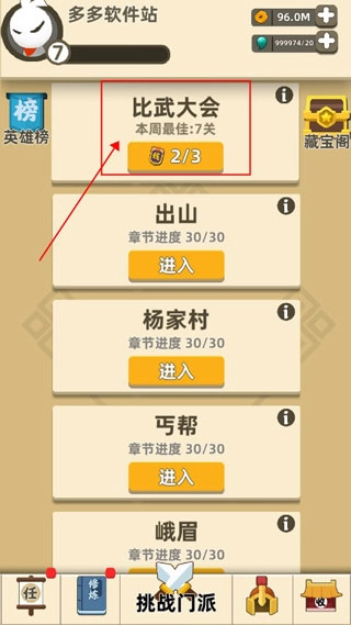 武林大会是检验强者实力的重要关卡,排名的高低并非只由装备决定,技巧、经验等多方面因素都会产生影响。其中,你成功闯过的关卡数量越多,在排行榜上的位置自然就会越靠前。玩家每天仅有3次进入武林大会的机会,可通过挑战门派的入口进入。