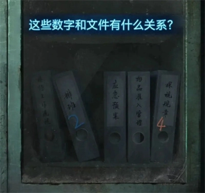 进入房间后先看看左边的柜子,从44号格子里取到一把剪刀,对了,36号的包看着有点眼熟,难道是莫黎的?再看看右边的柜子,提示说数字和文件有关联,这显然是简单的汉字数量对应关系嘛——第一个文件夹名称是6个汉字,第二个是2个,第三个4个,第四个6个,第五个4个,这样就得到了五位数字密码62464,得把它记下来。