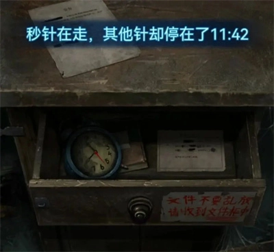 你可以检查一下中间那张桌子,桌上文件的时间暂时不用填写,下面抽屉需要的是五位数字密码,把密码调整到62464就能打开抽屉。打开后从右边拿到探视57号的申请表,左边的钟表点一下会显示时间停在11:42,这就是桌上收表的时间了。接着用圆珠笔在桌上的公告上把时间调整为11:42,听到脚步声就完成这一步了。