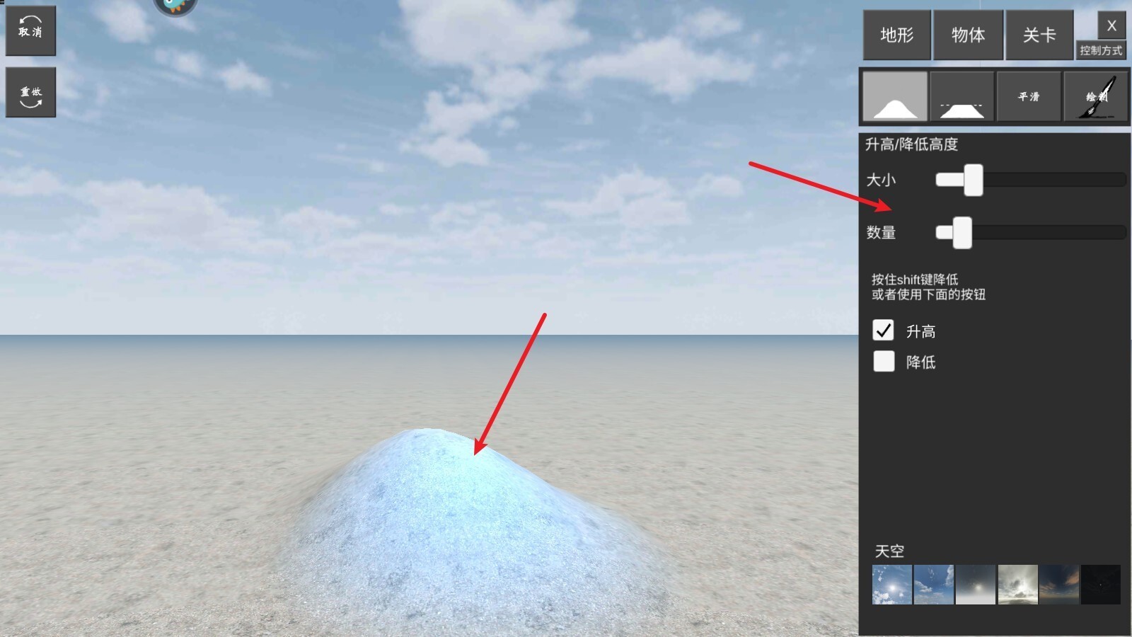 接下来我们点击蓝色光线照射的地方,这样就能使地形隆起或者凹陷下去。