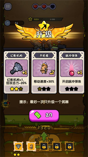 1、多种武器可供选择升级,不同效果等待你自由搭配。
