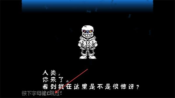 1、当前界面显示角色Sans的对话,看到提示按下字母键c跳过,按字母键c即可跳过这段对话内容,继续推进游戏的剧情流程。
