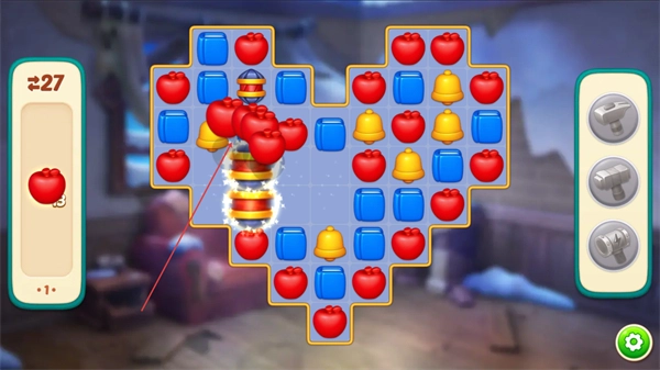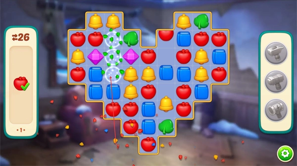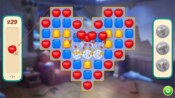 2、消除红色苹果这类相同图案,积累左侧进度条的数值,以此推进关卡。