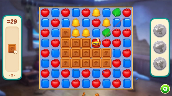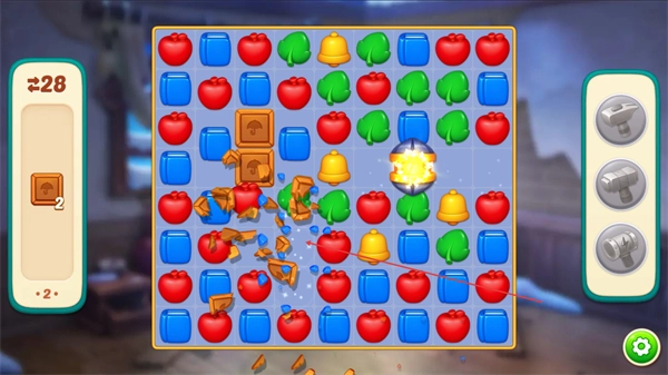 1、消除木板图案,积累左侧进度条,同时触发特效道具如爆炸类批量消除图案。