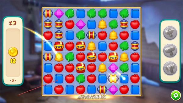 3、消除红色苹果等图案,完成左侧进度条目标,同时留意点击任意位置跳过提示,可快速推进动画。