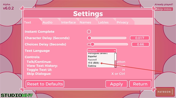 3、在语言下拉列表中,选择中文简体选项,即可将游戏的文本语言切换为简体中文,方便后续理解游戏内容。