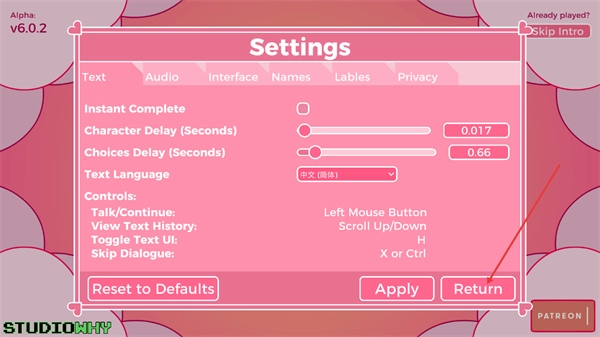 4、完成语言设置后,点击Apply按钮应用设置,再点击Return按钮,即可返回游戏主界面,继续进行游戏操作。