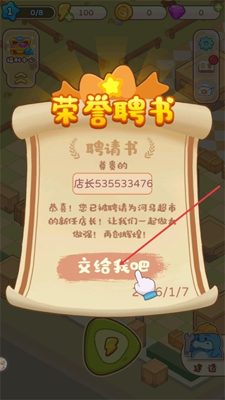 1、进入游戏后会出现荣誉聘书,显示你被聘为河马超市新任店长,点击交给我吧按钮即可确认聘任,开启超市经营流程。
