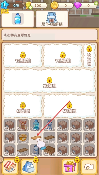 3、进入物品界面后,可查看各类商品的解锁等级,按提示点击合成对应物品,能获取所需商品,为后续订单做准备。
