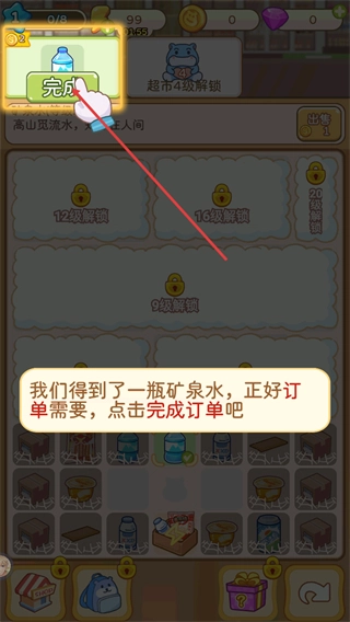 4、在获取到订单要求的矿泉水后,点击界面上的完成按钮,就能提交订单,完成这笔经营任务从而推动游戏进度。
