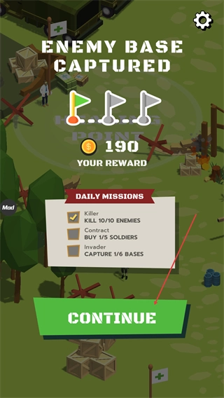 4、占领敌方基地后,领取190金币奖励,点击CONTINUE继续游戏。