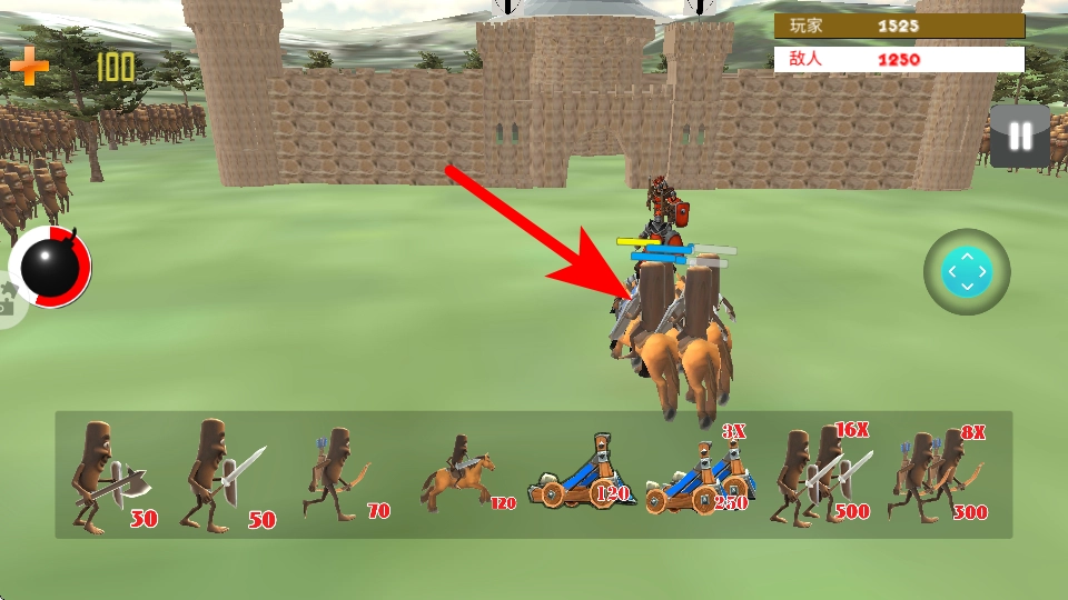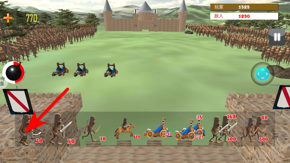 点击“开始游戏”按钮进入关卡选择界面,选择第一关即可开启挑战。游戏过程中,右侧遥感用于控制镜头移动;左侧炸弹准备就绪后,先点击选中炸弹,再点击敌方所在区域就能完成引爆。底部兵种栏中点击想要召唤的兵种,然后点击战场对应位置即可完成部署。需要注意左侧显示的剩余金币数量,合理调配资源来召唤刀斧手、盾兵等不同兵种协同作战。