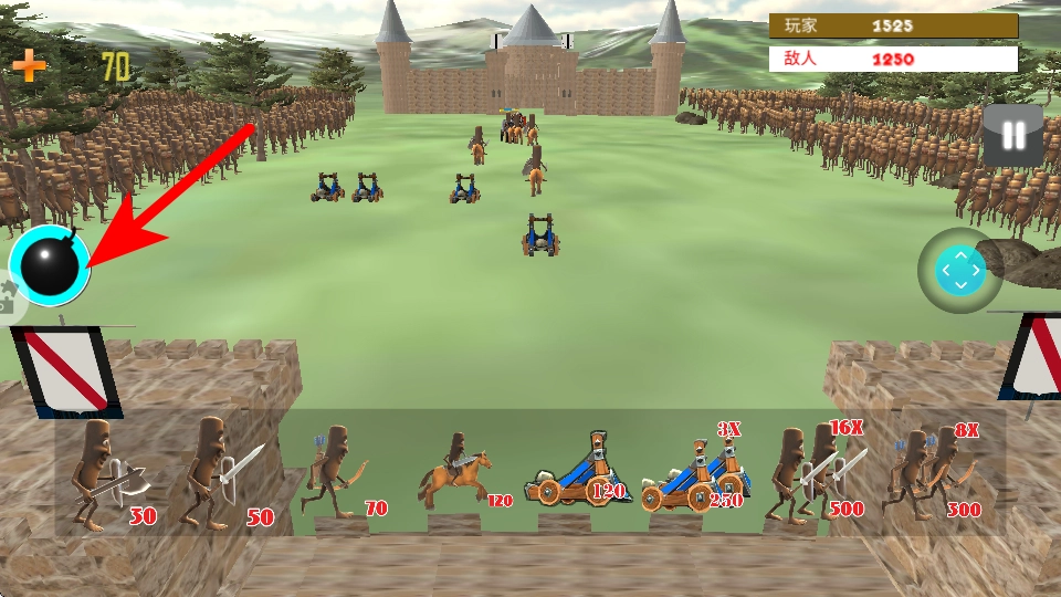 3、点击左侧的炸弹道具,对敌方军团发起范围攻击,以此削弱敌方的兵力优势。