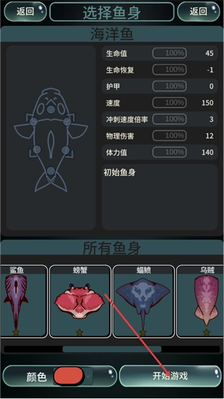 2、进入鱼身选择界面后,你可以挑选初始鱼身或是已经解锁的鱼身,同时还能查看每个鱼身对应的生命值、速度等属性信息。选好鱼身后,点击“开始游戏”按钮,即可进入关卡。