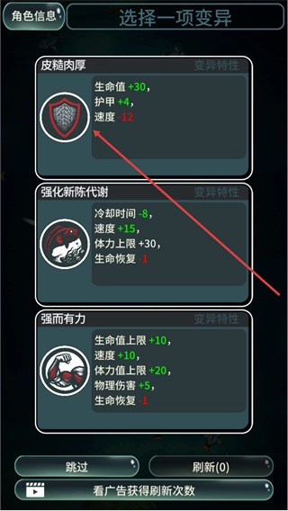 变异能力种类丰富,涵盖攻击强化、防御提升、特殊技能等多种类型,每次升级都会随机解锁新变异,可自由搭配组合,适配不同的战斗与生存策略。