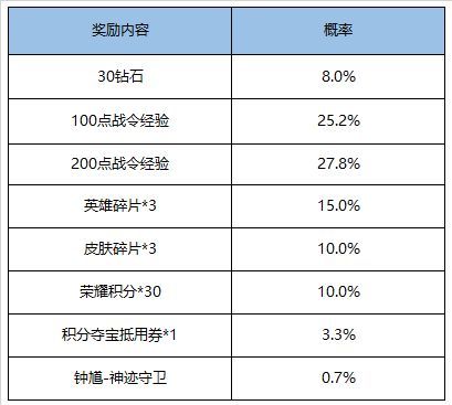 打开可获得以下奖励之一:钟馗-神迹守卫、积分夺宝抵用券*1、英雄碎片*3、皮肤碎片*3、荣耀积分*30、100/200战令经验、钻石*30。