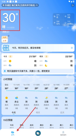1. 点开天气应用类别,进入天气界面,查看东城区的实时天气情况,此时温度显示为30°,天气状况为晴,同时查看明天等时段的天气变化以及15日的天气预报信息。