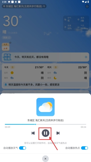 2、在天气页面,能够找到并点击对应的播放按钮,即可播放天气音频,从而了解天气的语音播报内容。