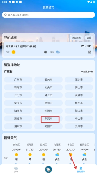3、轻点底部的“我的城市”选项,即可进入我的城市页面。接着在搜索框内输入城市或者乡镇的名称,就能查找你想要查看天气的区域。