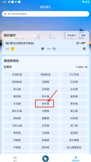 4、还能在页面所展示的已有城市,例如广东省东莞市里,挑选具体的街道,像常平镇,进而查看该相应区域的天气状况。