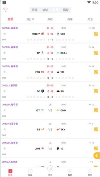 1、首页呢,自然是大家最为关注的比赛。留意一下,界面上方有一排不太起眼的按钮,通过它们能够切换比赛类别哟。