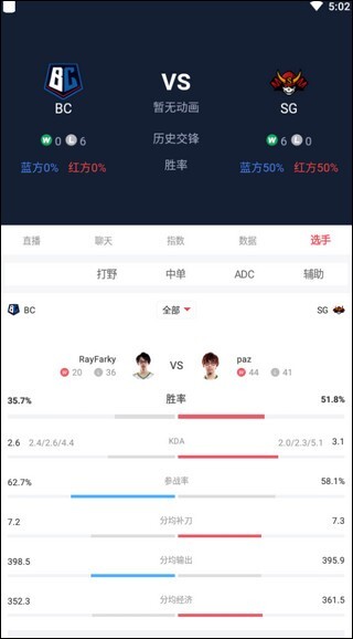 2、任意进入一场赛事,便能发现数据极为齐全。就拿英雄联盟比赛来说,每位选手的数据都清晰明了。