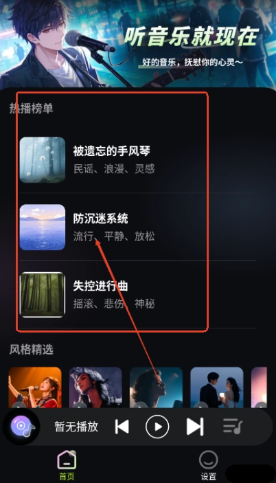 3、多元歌单:软件内包含热播榜单、风格精选等丰富多样的歌单,播放列表展示清晰明了,助力你轻松发掘热歌与新歌,满足不同用户在各类听歌场景下的需求。