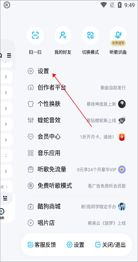 1、打开酷狗音乐,点击右上角的箭头图标。