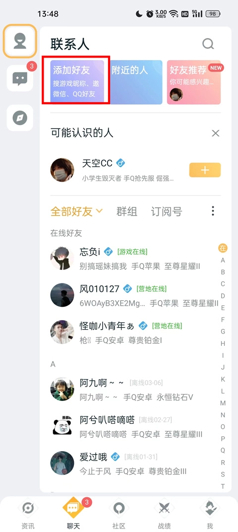 3、点击下方的“聊天”后,会进入联系人页面,页面上方有三个端口,分别为添加好友、附近的人、好友推荐,选择添加好友。