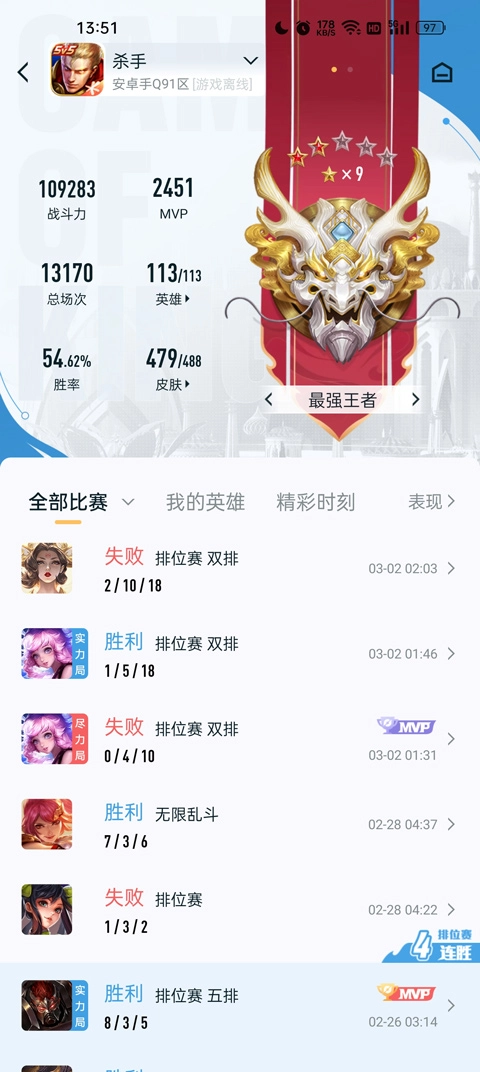 1、于王者荣耀战绩查询的战绩大厅里,不但能够查看全部比赛的所有战绩,像场次、胜率、mvp次数、战斗力等信息也都能在线查询。