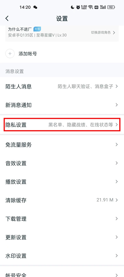 3、进入设置板块后,向下滑动,找到“隐私设置”并点击进入。