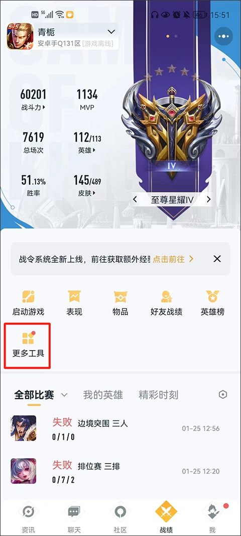 2、切换底部导航栏至“战绩”页面,在该页面中能看到一个工具栏。