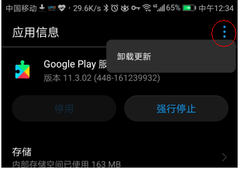 2. 查找Google Play服务,点击进入该服务页面,查看右上角是否有3个点的图标,若存在则选中此图标,接着选择卸载更新。