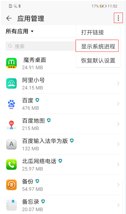 1. 打开设置,通过搜索进入应用管理页面,点击更多(⋮)> 显示系统进程 。