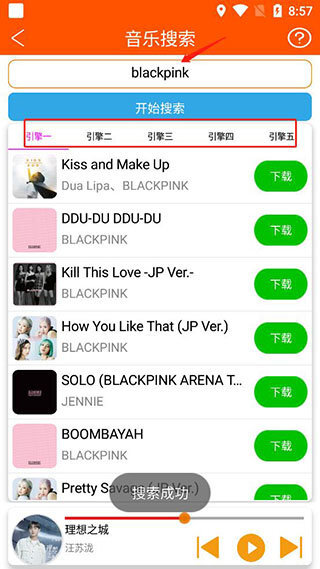 2、你还能在搜索框里搜索歌手或歌名来播放,此外还给出了多个引擎的搜索结果。