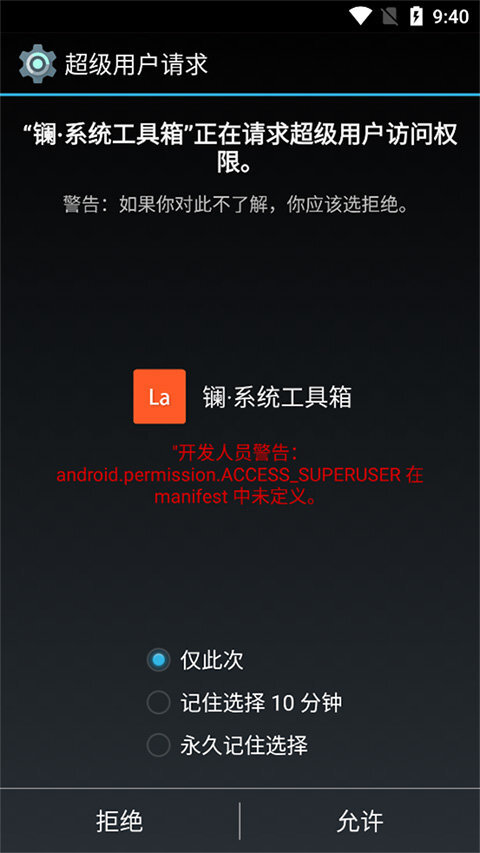 首先,用户打开该软件,随即会出现如下页面提示。此提示旨在让用户允许软件获取手机超级用户的使用权限,以便软件能更顺畅地运行。通常情况下,默认选择【仅此次】选项后,再进行允许操作。