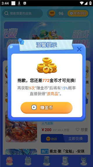 3、最近点击立即兑换,赚金币即可兑换皮肤。