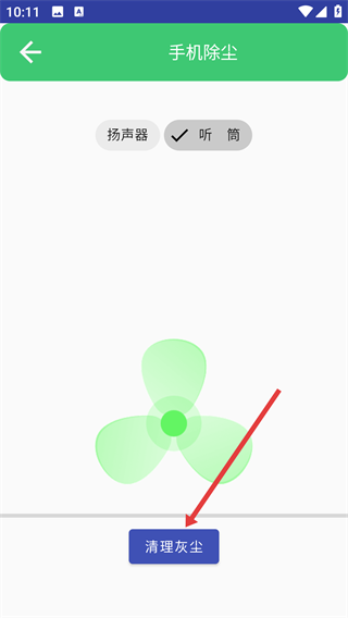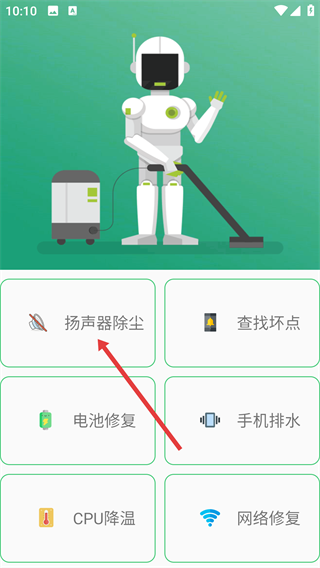 1、在软件功能界面找到并点击【扬声器除尘】选项,即可进入手机除尘的操作页面。