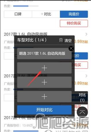 4、此时会弹出车型对比窗口,若当前仅显示一款车型版本,则需添加其他对比车型版本,点击“+号”按钮即可。
