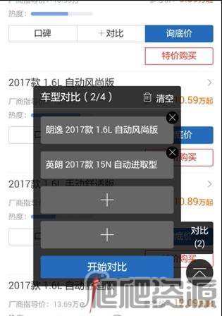 7、随后就能在车型对比板块里找到待对比的两款车型,点击“开始对比”按钮即可;需要注意的是,该功能最多支持添加4款车型同时进行对比。