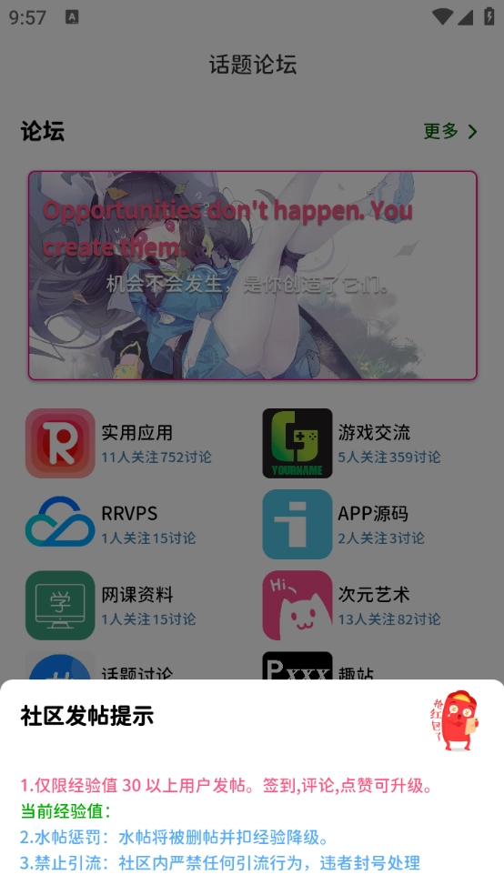 4、点击中间的“+”按钮即可发布帖子,但仅允许经验值达到30以上的用户进行发帖操作。用户可通过签到、评论和点赞等方式提升经验等级。当前经验值为[具体数值]。