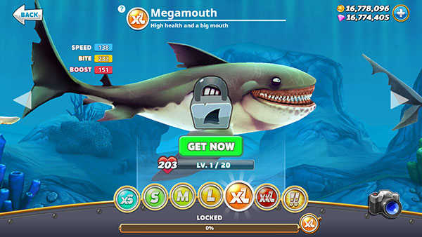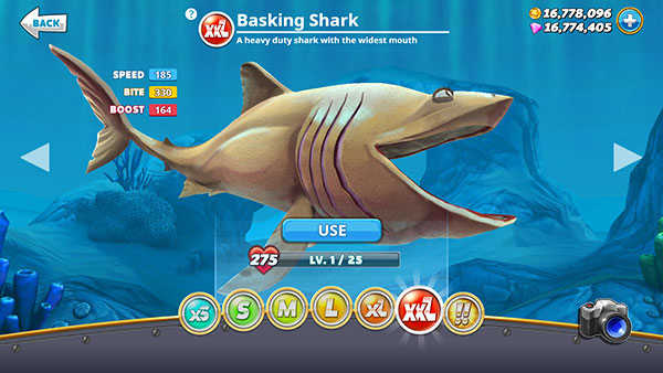 PS:玩家初入游戏时,会发现鲨鱼最高仅能解锁至XXL级。但实际上,玩家能够解锁的鲨鱼最高等级为!!级,也就是巨齿鲨。